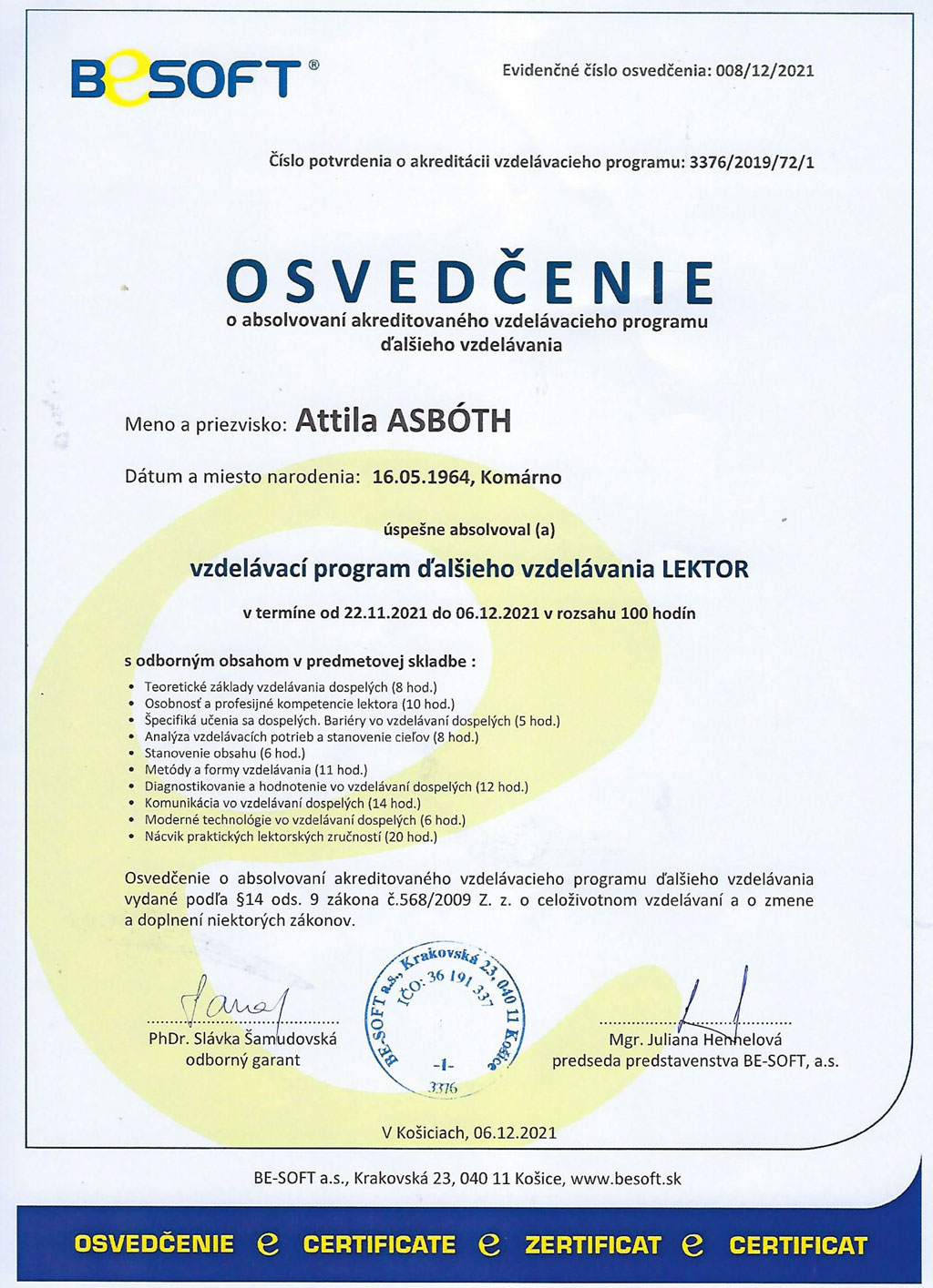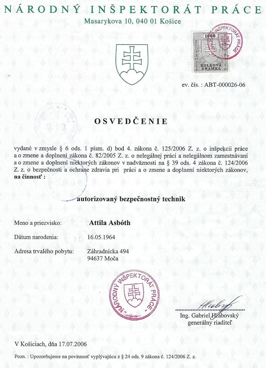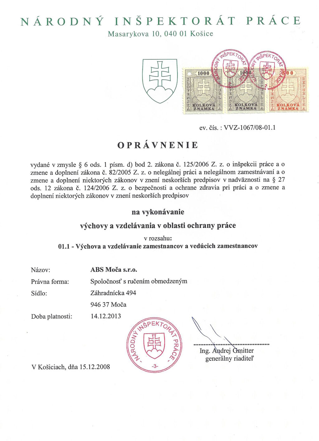 - vykonávanie činnosti autorizovaného-bezpečnostného technika (osvedčenia)