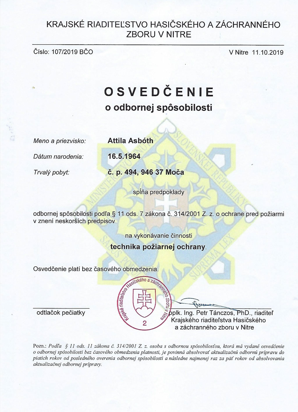 - vykonávanie činnosti technika požiarnej ochrany (osvedčenia)