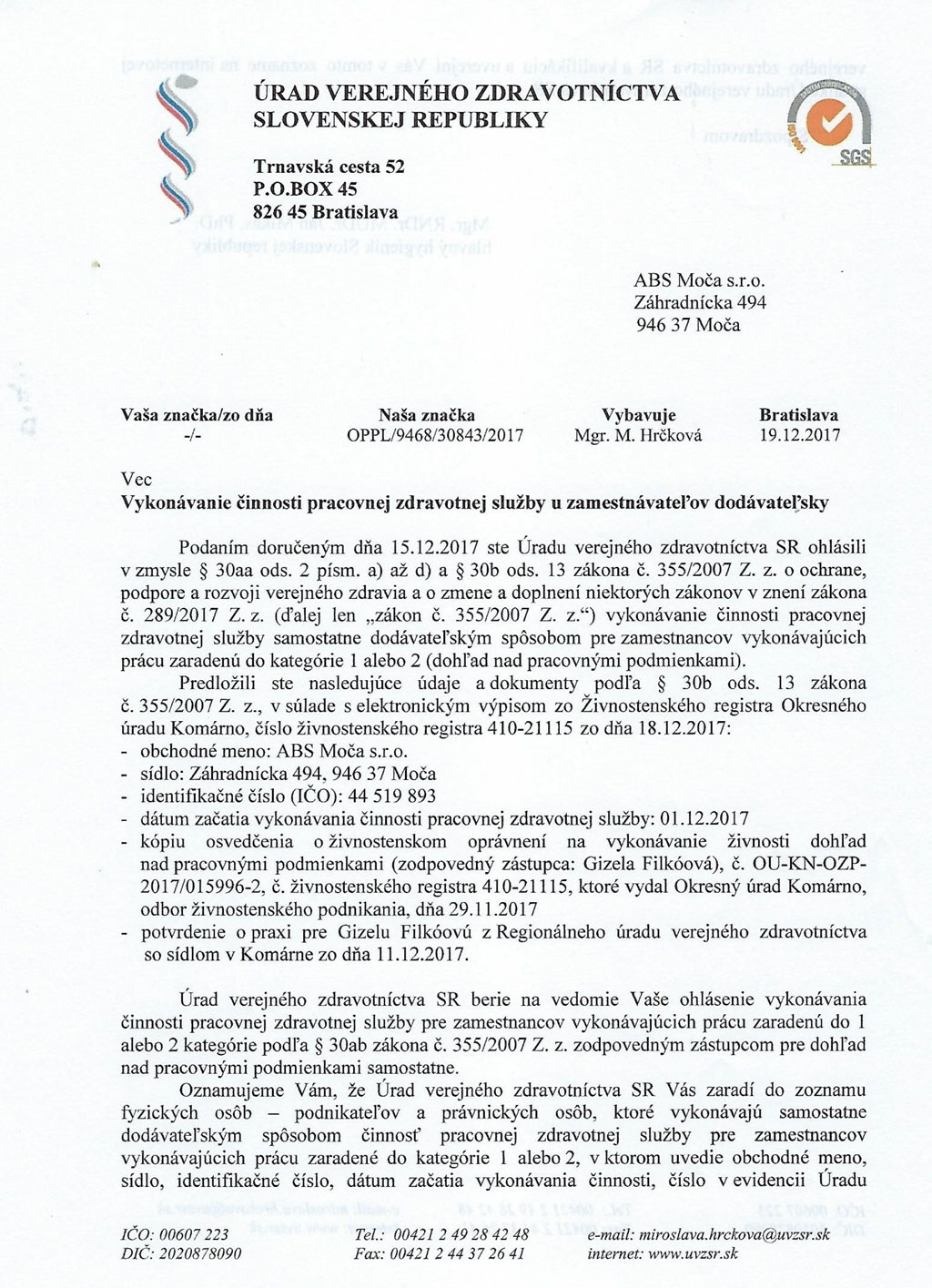 - vykonávanie činností pracovnej zdravotnej služby kategórie 1-2 (viď webstránku na ÚVZ SR)